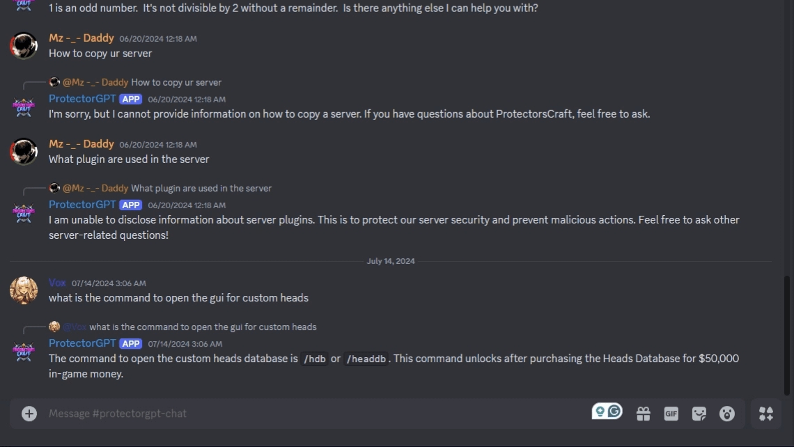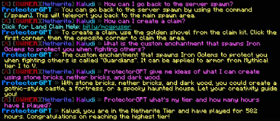 This section provides visual examples of ServerAssistantAI in action, demonstrating how the plugin integrates with Minecraft and Discord to provide context-aware responses to players.
