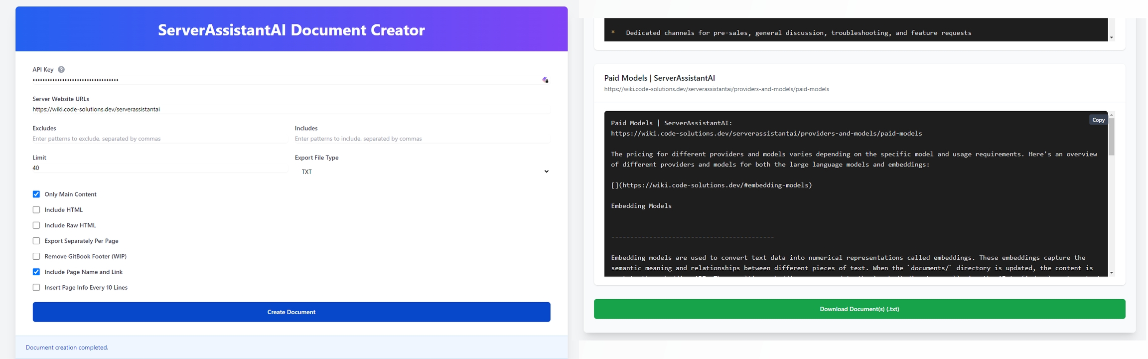 The ServerAssistantAI Document Creator is a web-based tool that simplifies the creation of documents for your server by crawling and converting content from multiple websites. It currently uses FireCrawl's API but will soon not require it.